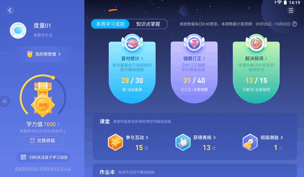 学习机的激励体系希望能看见学生的每一次努力,通过正向的反馈调动其积极性,同时满足学生个性化发展需要。学力值体系通过积分让努力沉淀累积,并给予正向反馈,通过学力值积攒,支持学生获得学习等级,并兑换头像、挂件等学习奖励。同时学生还可以获取奖状,勋章等肯定。通过成长档案,建立学生画像,提出学习建议,推动学生不断反思和进步,为下一阶段学习做准备。
