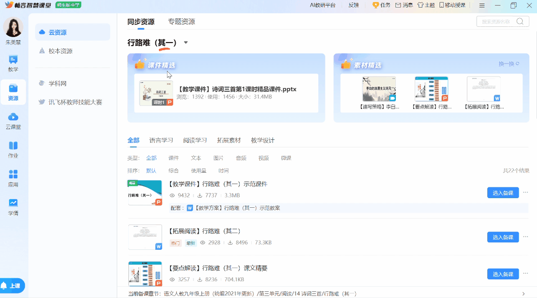 通过运用大数据、地域相关度、用户画像、语义理解等AI技术,结合精品、最新、最热等多维度资源标签和用户标签体系,实现了备课场景下资源到书、到课、到章节以及教学环节的精准推荐,课堂中的即时搜索、精准推荐,大幅提升了教师备授课的资源查找效率,由原先的“人找资源“到现在的”资源找人”。