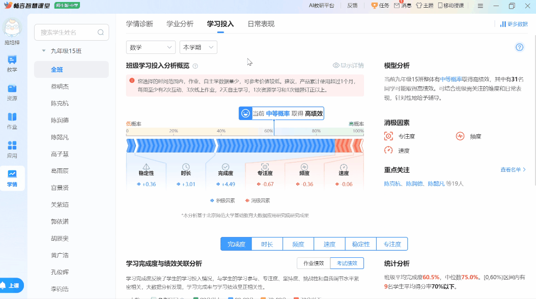 建立机器学习模型,通过学生的关键学习投入指标对学习绩效进行预测;利用可解释技术,对影响绩效的关键行为进行分析,并以新颖的可视化方案进行呈现;将群体学生学习投入行为与学习绩效进行关联,并为教师提供针对性的教学建议;建立学习者学习投入数据常模,帮助教师定位不同学生需要关注的学习环节。