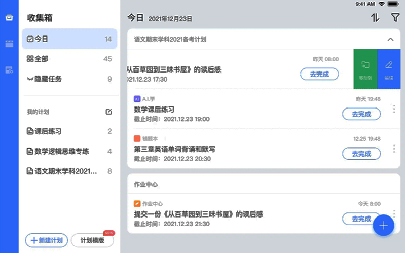 通过AI学习计划,帮助学生汇集教师布置的任务、系统推荐的任务以及自己制定的任务,按照学科、类型、时间进行分门别类。同时辅助学生制定学习任务,让学生自主制定分学科的学习目标,系统在过程中督促学生,并在学习完成后引导总结复盘,让每一个学生成为学习的主人。